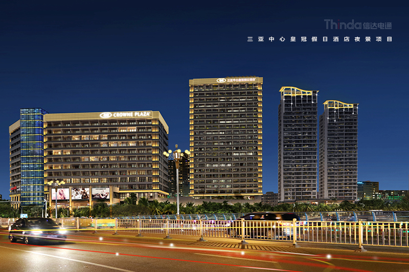 酒店照明離不開智能與節能,所以藝術化的燈光設計,還需要搭配智能化的燈光控制,完善酒店的照明體系。三亞中心皇冠假日酒店是信達電通對三亞主城區夜景提升項目中的重要建筑,酒店的燈光設計與三亞主城區的夜景定位相一致,并采用信達電通自主研發智能照明控制系統,根據時段不同開啟不同的亮燈模式。夜幕時段,整座酒店點亮,與周圍道路夜景渾然一體。傍晚和凌晨時段,只點亮樓頂的廣告標志牌和亮化樓頂結構,可達到遠觀醒目的效果,實現了燈光的高利用率和節能效果。