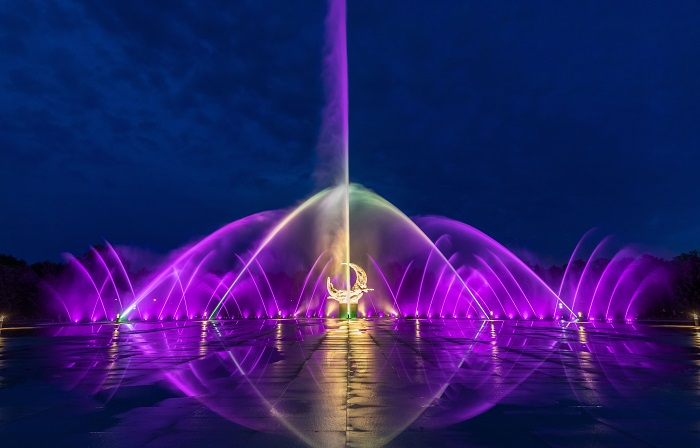 這也是東北地區首個大規模的雙扇噴泉水幕燈光秀。噴泉以女神像為中心,高中噴水泵矩陣排布,最高水柱可達60米,伴著音樂的動感節奏和光色的斑斕變化,劃破公園夜空,帶來全新的夜游體驗。