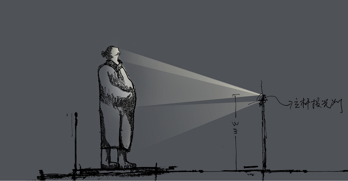 《高山流水》青銅雕塑,參考秦兵馬俑的照明手法,以白色燈光重點(diǎn)照亮雕塑頭部,仿佛在迎著陽光沉思。