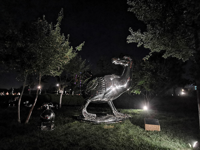 《渡渡鳥》用樹影燈映亮雕塑周圍環(huán)境,以小型投光燈重點(diǎn)強(qiáng)調(diào)雕塑局部,仿佛渡渡鳥又回到了這個世界。