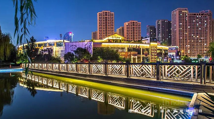 以及一些橋梁通過(guò)在兩側(cè)設(shè)計(jì)噴泉水景,用染色燈光進(jìn)行渲染,進(jìn)行噴泉水景的變幻結(jié)合燈光的演繹,來(lái)造就一種情景美與交互美,這是一種象征性手法,可以給原本靜態(tài)的橋梁通過(guò)動(dòng)態(tài)化、擬人化的情感表達(dá),來(lái)進(jìn)行橋梁亮化渲染。