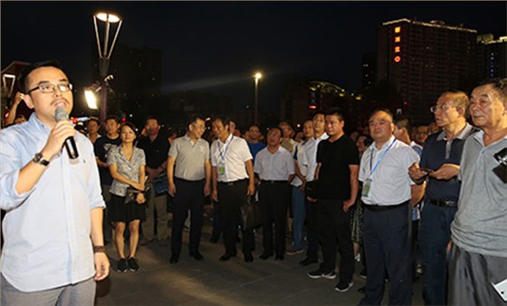 首先考察組一行來到唐城墻遺址公園北廣場,高新區夜景照明及唐遺址公園燈光秀的總設計師、北京信達電通科技董事長王春龍先生給眾領導講解由信達電通設計策劃的高新區夜景亮化提升方案。