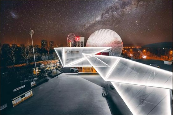 影院高32.8米,總占地總面積3600平方米。外觀的球形頂,代表著神秘浩瀚的宇宙和閃爍星空,神秘又等待著探索。外圍建筑狀似飛翼,采用的是鋼絲膜強(qiáng)化來(lái)建筑造型,展現(xiàn)建筑“飛躍”之勢(shì),正與“飛越中國(guó)”這一主題相契合!