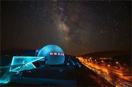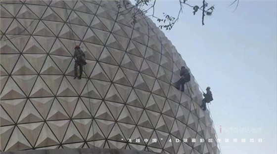 隨著球幕外立面光色切換,“我愛(ài)你中國(guó)”、“飛覽天下飛越中國(guó)”等主題字幕滾動(dòng)播出。為實(shí)現(xiàn)預(yù)期的設(shè)計(jì)效果,信達(dá)團(tuán)隊(duì)多次夜間試燈。