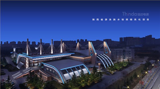 陜西省游泳跳水館是信達電通在西安高新區規劃項目中的一環,游泳館外觀狀似揚帆遠洋的旗艦,其建筑結構、配套設施等都屬國內先進。信達電通依據建筑本身特性對建筑的輪廓和頂部進行重點照明,突出建筑結構。燈光采用冷暖色調結合的方式,依照西安高新區整體的照明規劃,加強與周邊建筑的銜接與互動。