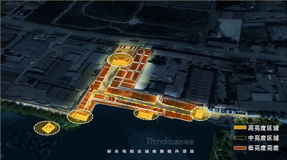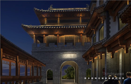 亮化設(shè)計(jì)從宏觀和微觀兩種尺度入手:在宏觀上強(qiáng)調(diào)整體性,建立清晰的夜景結(jié)構(gòu)并區(qū)分主次,體現(xiàn)青磚黛瓦,淡雅風(fēng)華,那種褪盡喧囂之后的寧靜和內(nèi)斂。在微觀上,以人為本實(shí)現(xiàn)照明的舒適性,營造溫馨雅致的光環(huán)境。本案中雞鳴古城亮化設(shè)計(jì)將主入口處城樓及親水樓臺為高亮度區(qū)域,沿街立面烘托商旅氛圍為中亮度,建筑頂部營造靈境、淡雅的光環(huán)境,弱化表現(xiàn)為低亮度區(qū)域。主體光色以暖光呈現(xiàn),靜態(tài)光為主。燈光主要體現(xiàn)其渾厚、大氣的建筑結(jié)構(gòu),打造整體感與形態(tài)美,滿足建筑自身功能和精神需求的同時,突出顯著入口標(biāo)志。以間隔小投光形式呈現(xiàn),突出入口醒目標(biāo)志和節(jié)點(diǎn)設(shè)計(jì)。拒絕大面積重彩潑墨,以投光進(jìn)行小范圍營造,點(diǎn)綴成景,留白處理,避免喧鬧、浮華,營造靜謐、文雅的氛圍。燈光錯落有致,層次分明,有熱鬧活力的商旅氛圍,也有溫馨雅致的古典情懷,使人漫步其中,移步異景,感受她的舒適與雅致。