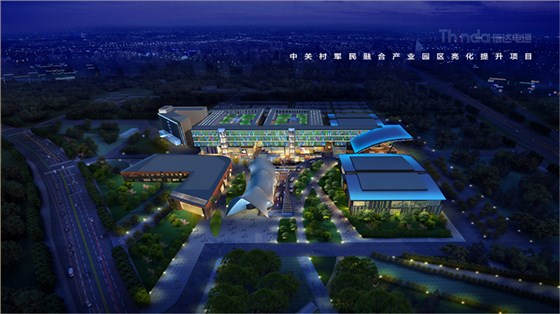 中關村軍民融合產業園區的亮化設計主要以建筑燈光為主體設計方向,用燈光的形式突出建筑結構特點,突出時尚、創新、科技、新潮的融合產業園。園區建筑結構整體簡潔、大氣,信達電通利用光影效果及景觀元素,打造東西、南北軸向的建筑縱身層次,整體以各種幾何形體組合而成,燈光在設計的同時尊重建筑本身的理念,優化夜景氛圍,通過塊與面的結合,塑造一個大氣魄、大追求的文化產業新品牌。