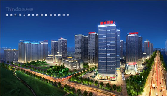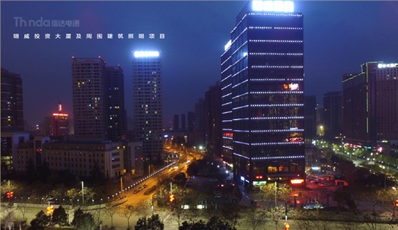 明威投資大廈的樓體照明中,信達電通設計師用“面光”替代“線光”,改善原有的照明缺失,點亮了明威投資大廈和周圍建筑群的建筑頂部,增加了整體的夜景照明效果,明威投資大廈建筑中部選用了層層排列的玻璃窗LED燈,周圍兩側的建筑分別采用了隱藏式LED流光燈和洗墻燈,凸顯每棟建筑的特色,建筑底部全部選用黃色投光燈,在夜色中給人一種溫暖的感受。