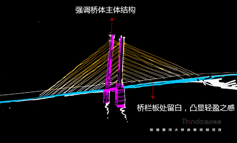 銀灘黃河大橋夜景亮化設(shè)計中我們以功能性、裝飾性照明為主,同時也避免高亮度、多光色對行車造成安全隱患。