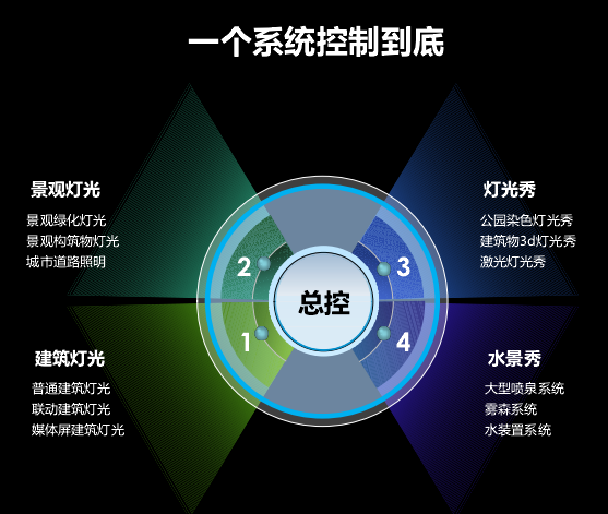 本項目采用“鼎立慧聯(lián)”智慧照明云服務(wù)平臺,通過云控制器的核心管理,景觀燈光、燈光秀、建筑燈光、水景秀實現(xiàn)了單一系統(tǒng)遠程控制、場景控制和數(shù)據(jù)監(jiān)控。